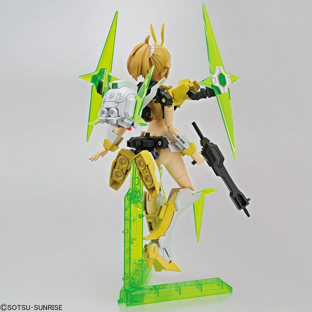 Watch out, here comes Winning Fumina! She’s amazingly posable after assembly, and her armor won’t interfere with action-packed posing! She can be displayed with or without her armor, too; the armor transforms into a super-deformed version of the Star Winning Gundam! She has her beam rifle, four large and four small effects parts, two sets of interchangeable hands, a display base, and stickers for her eyes and markings. Don’t miss the chance to add her to your lineup–order her now!