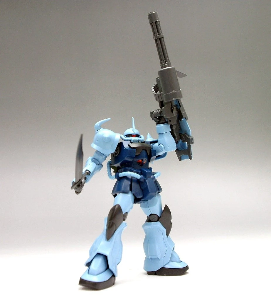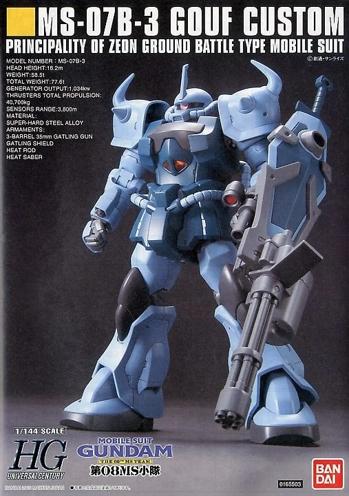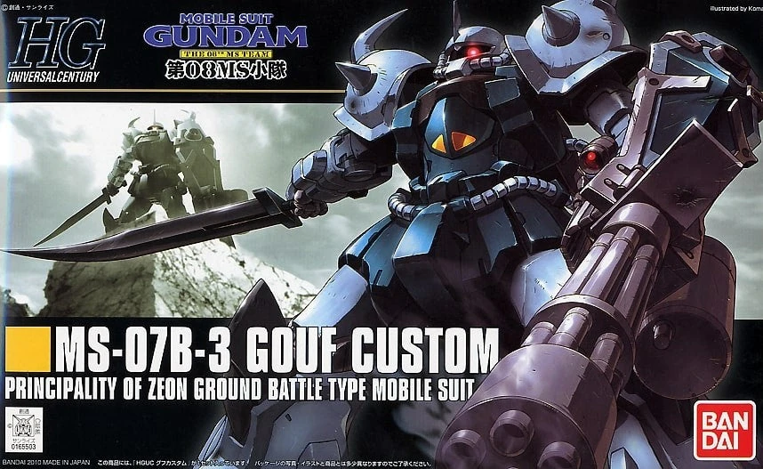 Thank you, Bandai! After more than a decade Bandai has released a new HGUC Gouf Custom The Gouf Custom has his signature shield with the huge gatling gun mounted to it, the hand mounted gatling, the Heat Rod which uses a flexible plastic piece and his Heat Saber. Stickers for the mono-eye and gun scope, as well as extra hands are included.