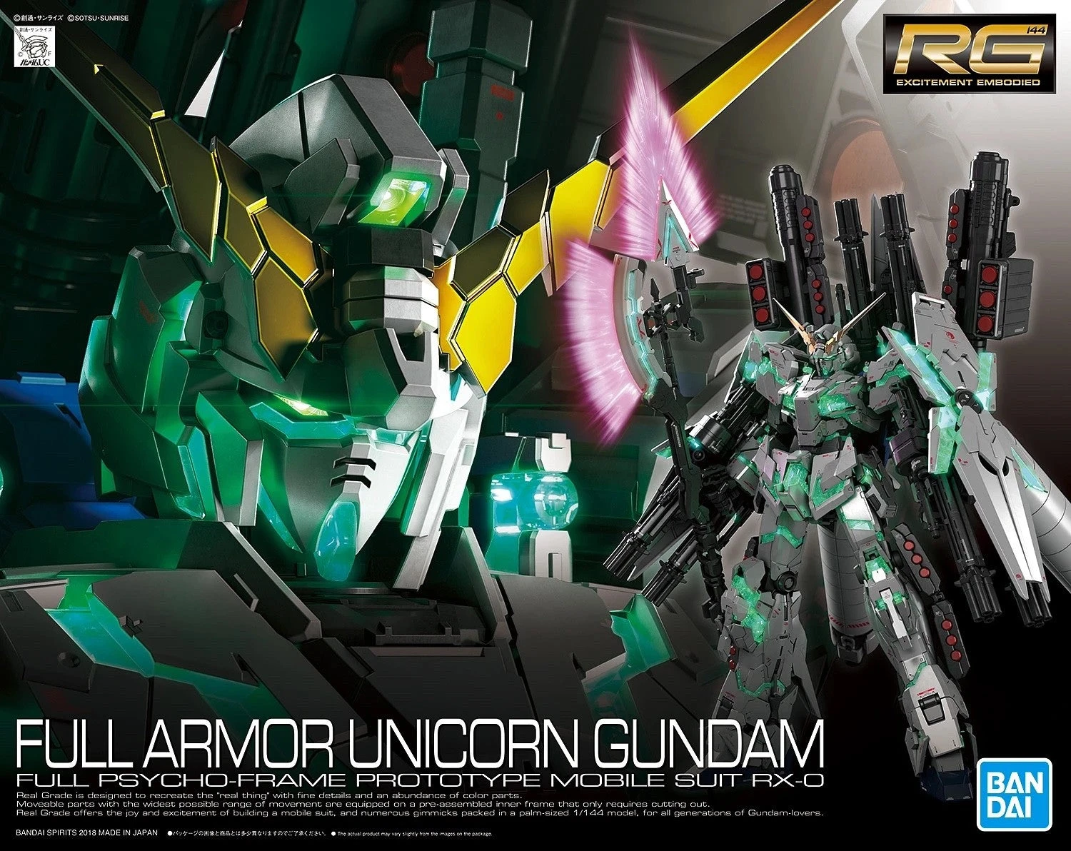 The Real Grade Full Armor Unicorn Gundam is armed to the teeth with its Beam Magnum, two Hyper Bazookas, Beam Javelin, and much more, including the pair of massive propellant tanks attached to its backpack! It snaps together for ease of assembly, and is molded in color so painting isn’t necessary, although you could certainly add some paintwork to make it really stand out on your shelf. Order yours today!