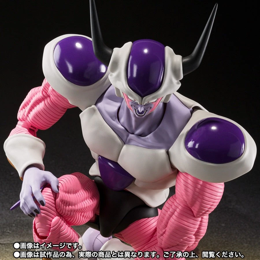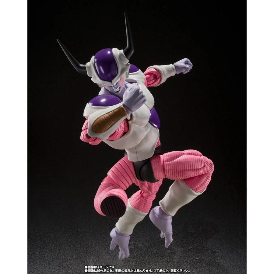 Frieza Second Form, from “Dragon Ball Z,” joins S.H.Figuarts! Includes three faces for re-creating dramatic scenes, including a smile plus grimacing and sneering options with special eyes. Optional hands let you re-create the climactic scene where Frieza lays Vegeta and friends low. Also includes a glowing Namekian Dragon Ball (four-star version), which you can add to the ones included with with S.H.Figuarts Dragon Ball Z figures (sold separately.)Set Contents: Main Body, Three optional expression parts, Two left and three right optional hands, Optional head part, One pair of optional legs, Optional tail, Namekian Dragon Ball (four-star version)