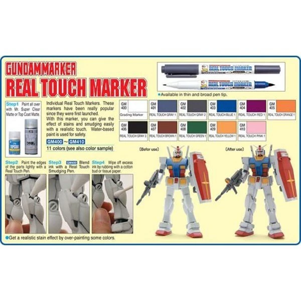 A pack of 6 Real Touch Gundam Markers for providing a very nice, subtle touch of detail for your completed model kits. Meant for reproducing weathering effects like grime, battle damage, stains, and also for panel lining. Includes Real touch gray 3, Real touch brown, Real touch green, Real touch yellow, Real touch pink, Grading (Blending) marker. Convenient set for realistic weathering and smudging painting effects. This is a set of water-based wipe off type markers.