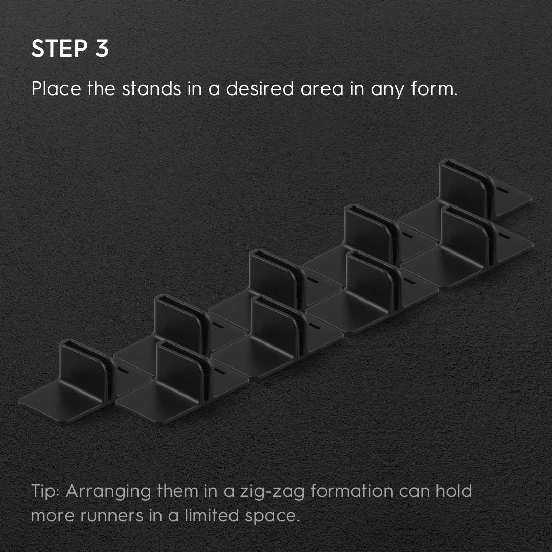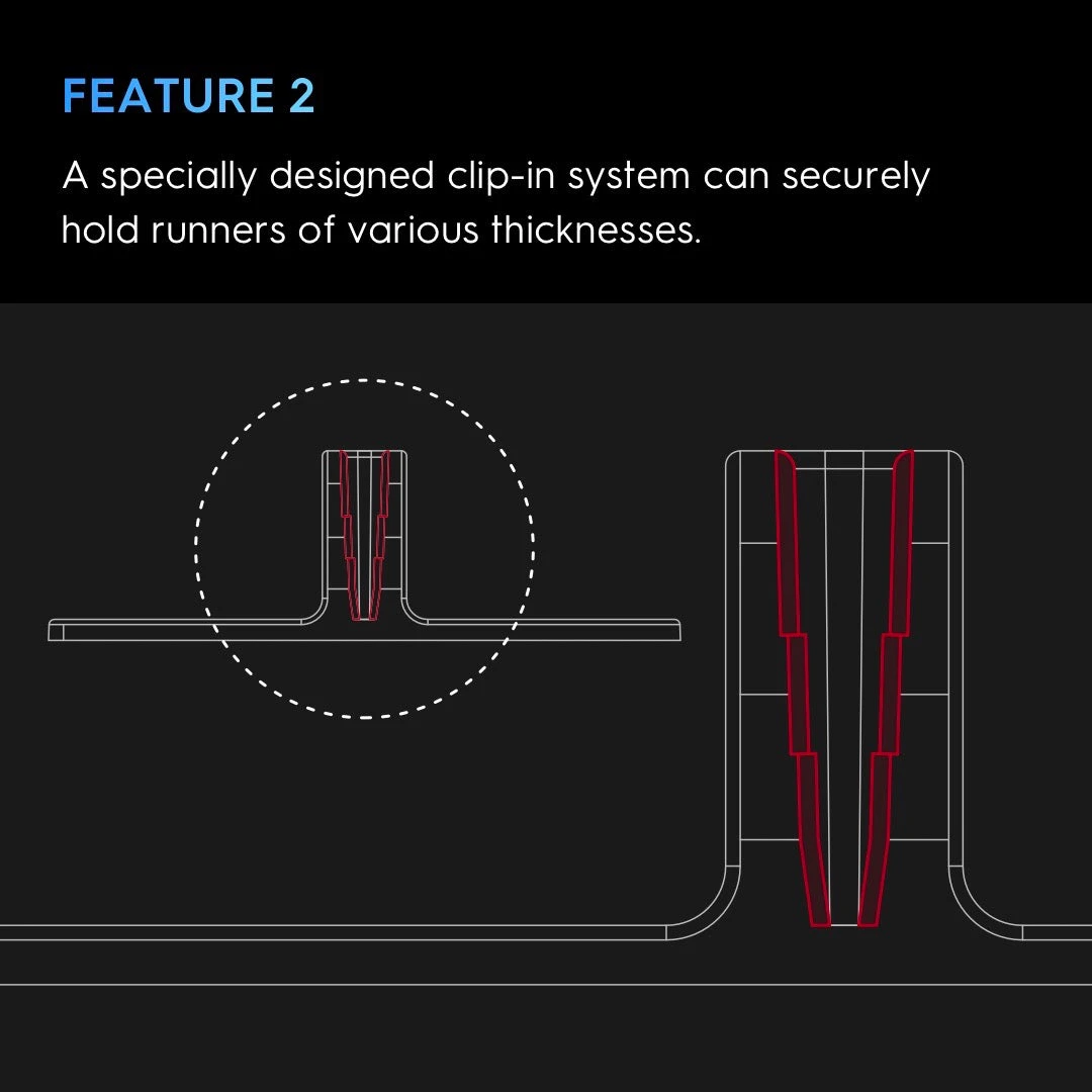 RUNNER CLIP is the market’s smallest minimalistic runner stand that saves working space and provides convenience and practicality. This product includes four clips.