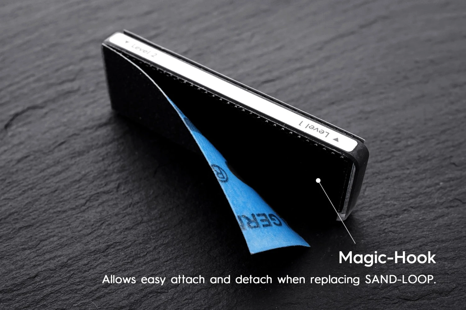 ​MINI HANDLE has appropriate handling weight and balance to allow precise sanding. Premium finish tempered glass is durable and provides an excellent grip. Each side of MINI HANDLE is composed with a Magic-hook system to secure the SAND-LOOP in place and allows easier attachment and detachment when replacing it. Unlike any other conventional product, it detaches easily and does not leave any adhesives. MINI HANDLE’s dual-sided design allows easy switching between two sides by attaching two different grits of SAND-LOOP on the Magic-hook on each side. One side edge is marked with indicator labels* to easily distinguish different grits for the user’s convenience. (*applicable for products since Sept. 2020)
