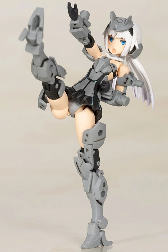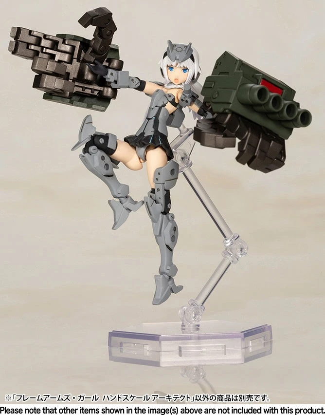 Based on the ‘Architect’ Frame Arms Girl model, this new Hand Scale brings her back in a new miniature scale that can fit in the palm of your hand! She comes with two pre-painted facial expressions and, despite her small size, boasts 20 point of articulation. Two ‘Impact Knuckle’ units are included, along with decals and back parts for users to switch between 2mm and 3mm connection points. Order this version of Architect for your collection today!