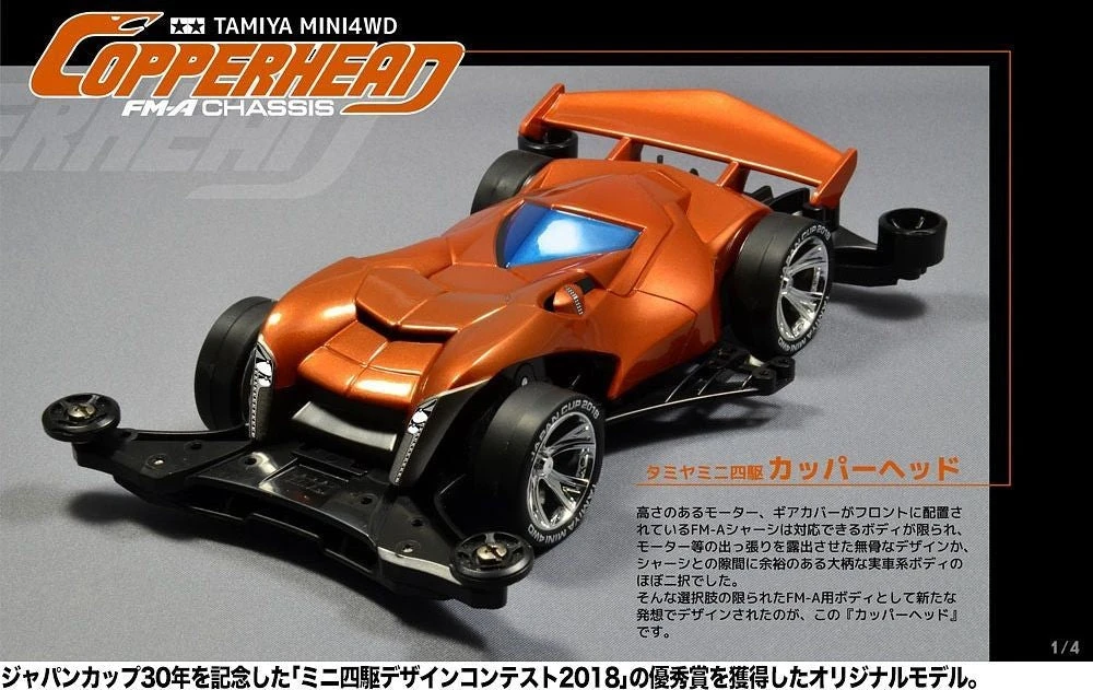 The Copperfang features an FM-A chassis in black, a body molded in metallic orange, and small-diameter super-hard low-height tires with A-spoke wheels in silverplate finish. Will be approximately 15.6cm long when assembled.